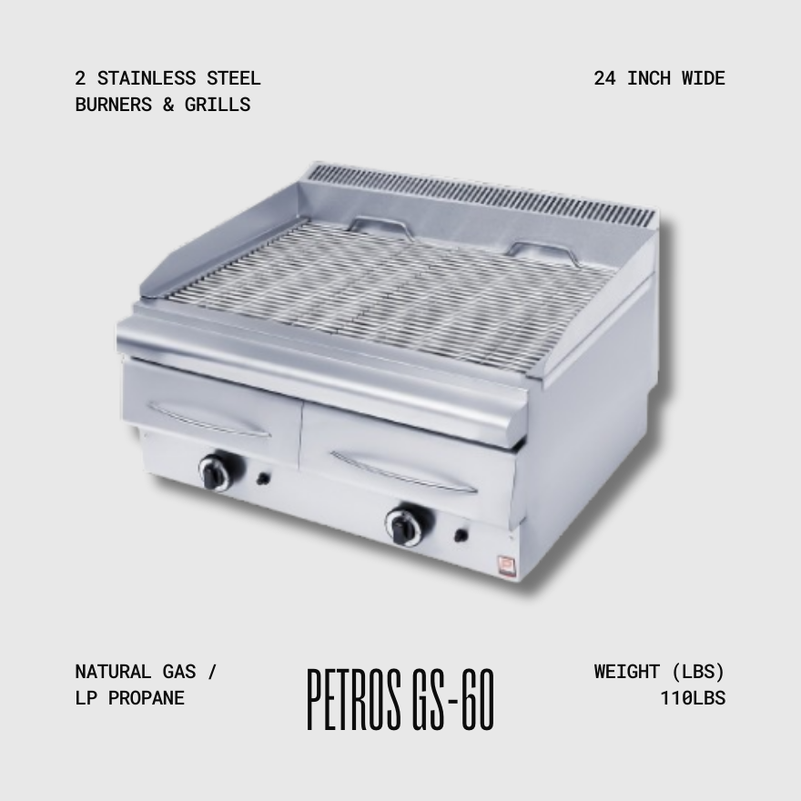 The Petros GS-60 is a 24-inch Heavy Duty Gas Vapor Radiant Chargrill designed for kitchens that want big performance in a compact footprint. Its vapor radiant cooking system enhances natural meat juices and delivers deep, smoky grill flavor with bold sear marks and even heat across the surface. Perfect for burgers, steaks, seafood, kebabs and grilled vegetables, it offers fast heat recovery and reliable temperature stability during busy service. Built with premium stainless steel for strength, hygiene and easy cleaning, the GS-60 is a durable, space-efficient chargrill that boosts flavor, efficiency and kitchen productivity.