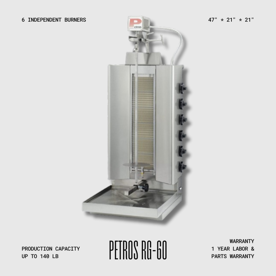 The Petros RG-60 is a premium Commercial Gas Shawarma, Gyros, Al Pastor and Doner-Kebab machine engineered with advanced Greek roasting technology and proudly made in Canada. Built for professional kitchens, it delivers powerful, consistent heat with independently adjustable burners and smooth rotation for perfectly caramelized edges and tender, juicy meat every time. Its heavy-duty stainless steel construction ensures durability, hygiene and long-term performance, while the efficient gas system helps reduce operating costs. With reliable craftsmanship, precise cooking control and a sleek commercial design, the RG-60 inspires customer confidence and boosts your kitchen’s productivity and profits.